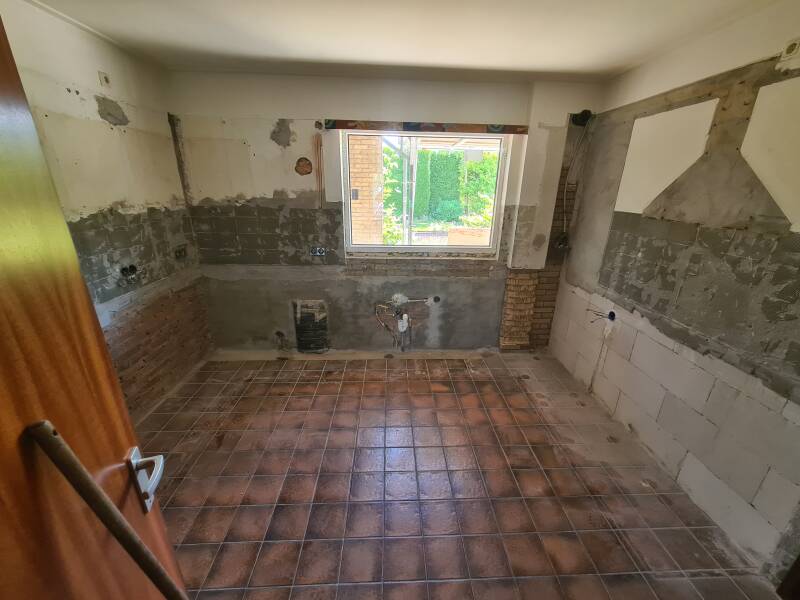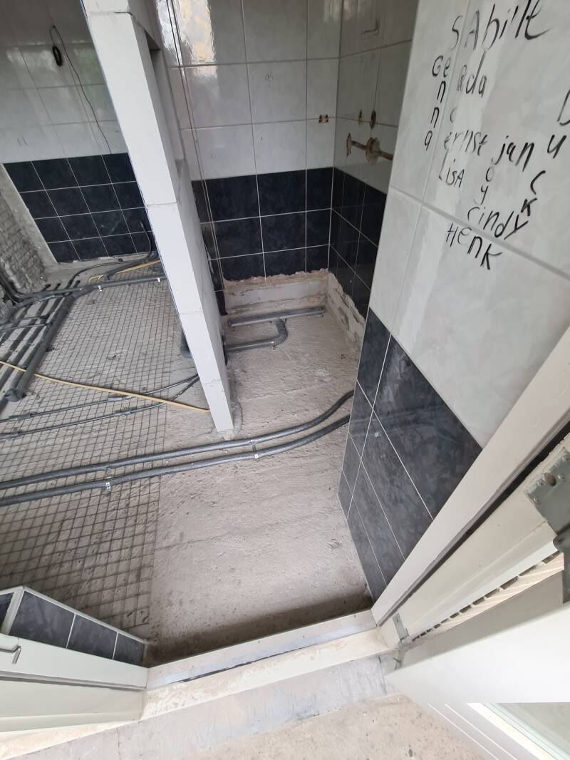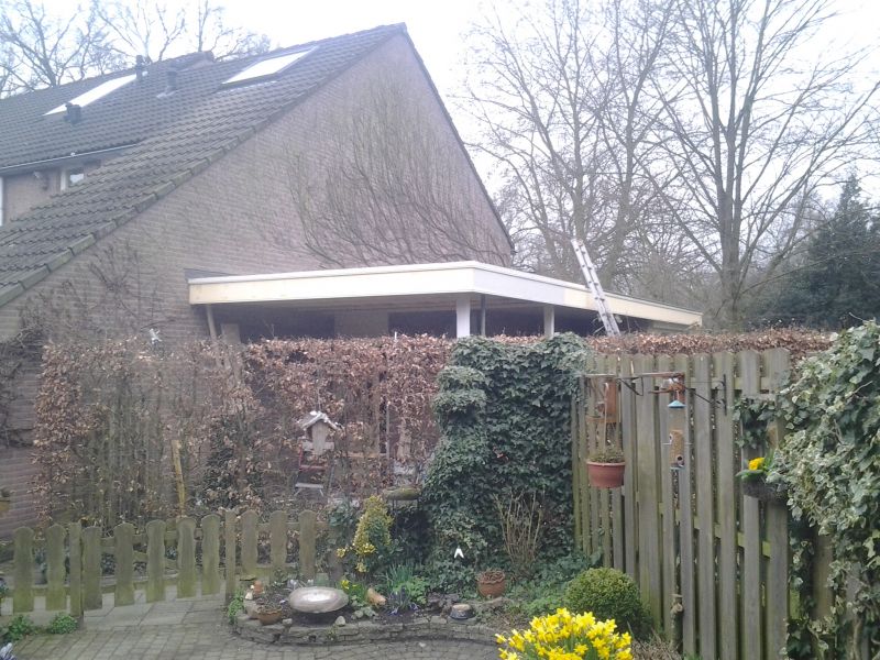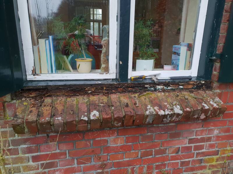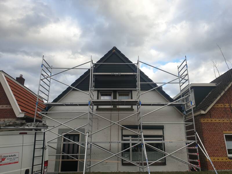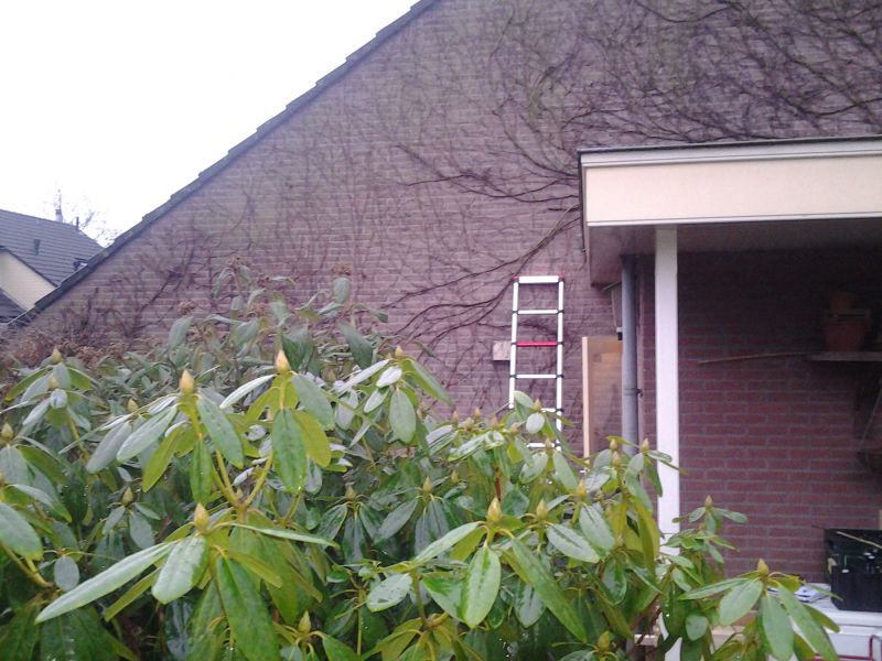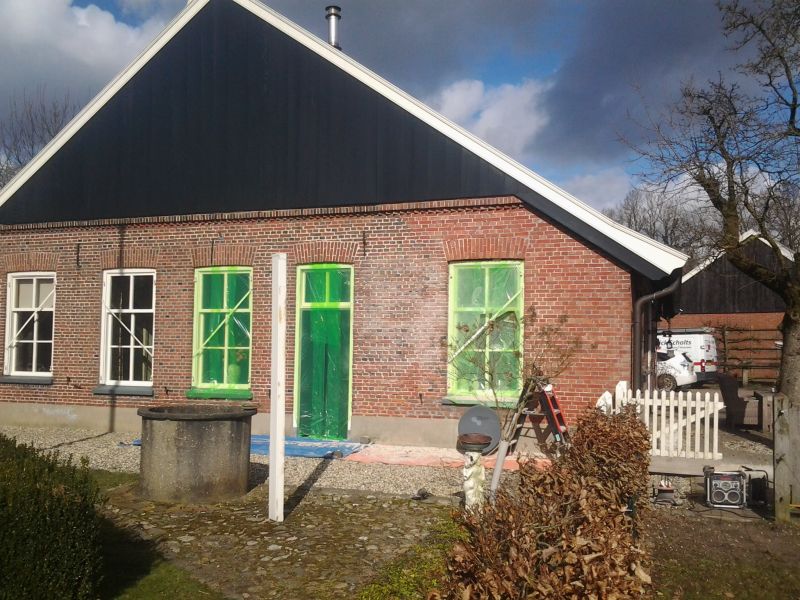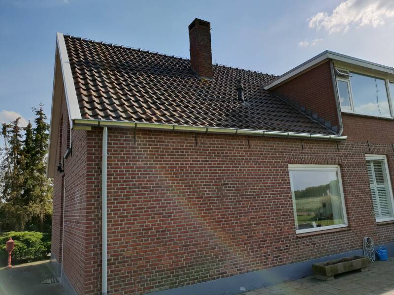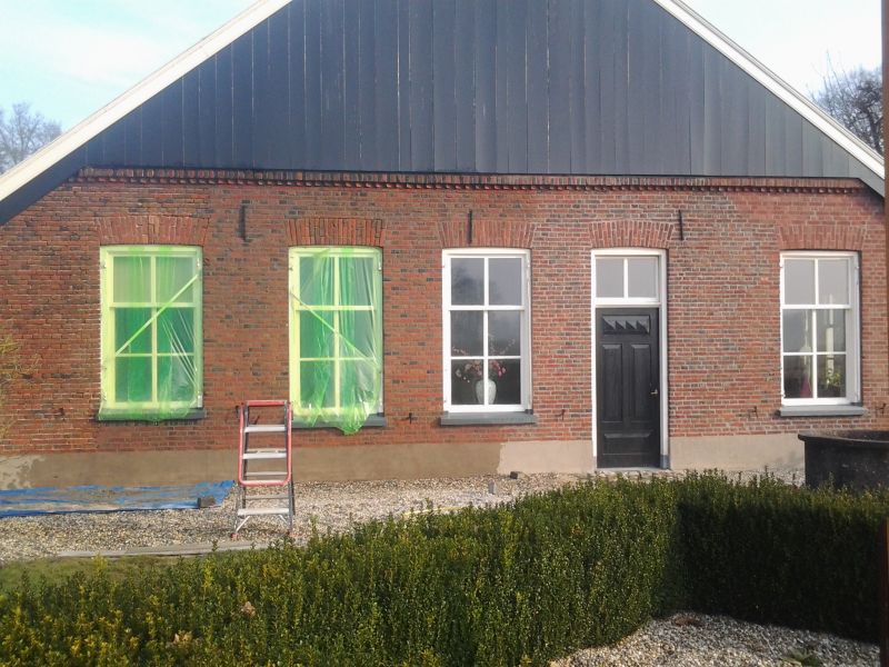Schoorsteen schoonspuiten, hakken en opnieuw voegen. In Huppel aan de Masterveldweg.